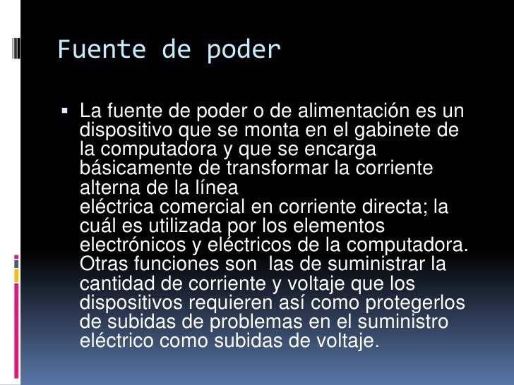 - 2. Fuente de poder La fuente de poder o de alimentación es un dispositivo que se monta en el gabinete de la computadora y que se encarga básicamente de transformar la corriente alterna de la línea eléctrica comercial en corriente directa; la cuál es utilizada por los elementos electrónicos y eléctricos de la computadora. Otras funciones son las de suministrar la cantidad de corriente y voltaje que los dispositivos requieren así como protegerlos de subidas de problemas en el suministro eléctrico como subidas de voltaje.