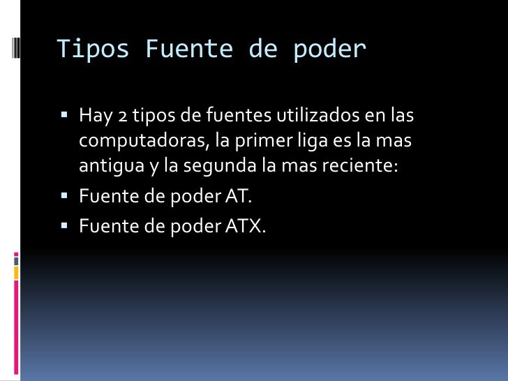 - 3. Tipos Fuente de poder Hay 2 tipos de fuentes utilizados en las computadoras, la primer liga es la mas antigua y la segunda la mas reciente: Fuente de poder AT. Fuente de poder ATX.