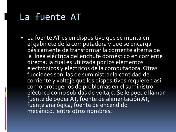 - 4. La fuente AT La fuente AT es un dispositivo que se monta en el gabinete de la computadora y que se encarga básicamente de transformar la corriente alterna de la línea eléctrica del enchufe doméstico en corriente directa; la cuál es utilizada por los elementos electrónicos y eléctricos de la computadora. Otras funciones son las de suministrar la cantidad de corriente y voltaje que los dispositivos requieren así como protegerlos de problemas en el suministro eléctrico como subidas de voltaje. Se le puede llamar fuente de poder AT, fuente de alimentación AT, fuente analógica, fuente de encendido mecánico, entre otros nombres.