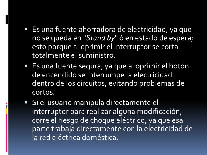 - 6. Es una fuente ahorradora de electricidad, ya que no se queda en "Stand by" ó en estado de espera; esto porque al oprimir el interruptor se corta totalmente el suministro. Es una fuente segura, ya que al oprimir el botón de encendido se interrumpe la electricidad dentro de los circuitos, evitando problemas de cortos. Si el usuario manipula directamente el interruptor para realizar alguna modificación, corre el riesgo de choque eléctrico, ya que esa parte trabaja directamente con la electricidad de la red eléctrica doméstica.