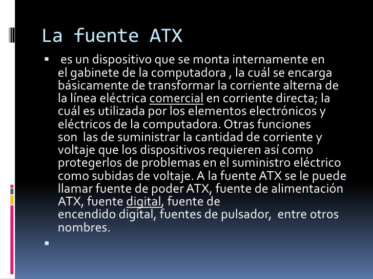 - 7. La fuente ATX es un dispositivo que se monta internamente en el gabinete de la computadora , la cuál se encarga básicamente de transformar la corriente alterna de la línea eléctrica comercial en corriente directa; la cuál es utilizada por los elementos electrónicos y eléctricos de la computadora. Otras funciones son las de suministrar la cantidad de corriente y voltaje que los dispositivos requieren así como protegerlos de problemas en el suministro eléctrico como subidas de voltaje. A la fuente ATX se le puede llamar fuente de poder ATX, fuente de alimentación ATX, fuente digital, fuente de encendido digital, fuentes de pulsador, entre otros nombres.