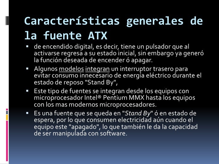- 8. Características generales dela fuente ATX de encendido digital, es decir, tiene un pulsador que al activarse regresa a su estado inicial, sin embargo ya generó la función deseada de encender ó apagar. Algunos modelos integran un interruptor trasero para evitar consumo innecesario de energía eléctrico durante el estado de reposo "Stand By", Este tipo de fuentes se integran desde los equipos con microprocesador Intel® Pentium MMX hasta los equipos con los mas modernos microprocesadores. Es una fuente que se queda en "Stand By" ó en estado de espera, por lo que consumen electricidad aún cuando el equipo este "apagado", lo que también le da la capacidad de ser manipulada con software.